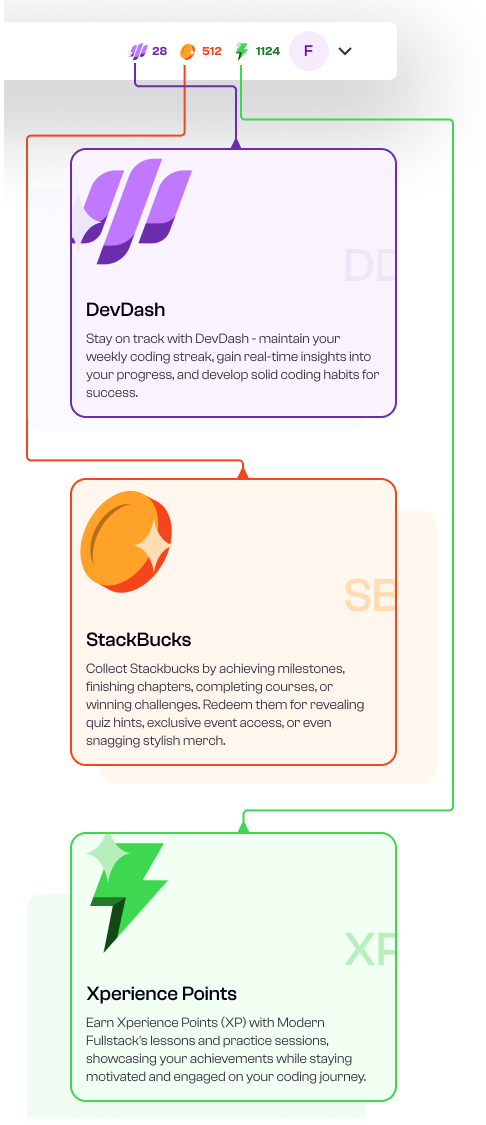 Finish quizzes at the end of each lesson, do practice sessions, and earn XP and StackBucks for every achievement. Maintain your streak with DevDash and challenge fellow learners on the leaderboard.
